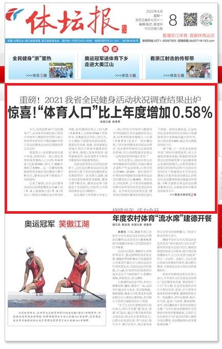 今天,是我国第14个“全民健身日”,由省体育局委托浙江师范大学体育与健康科学学院与浙江体育科学研究所开展的2021年浙江省全民健身活动状况调查结果正式出炉。