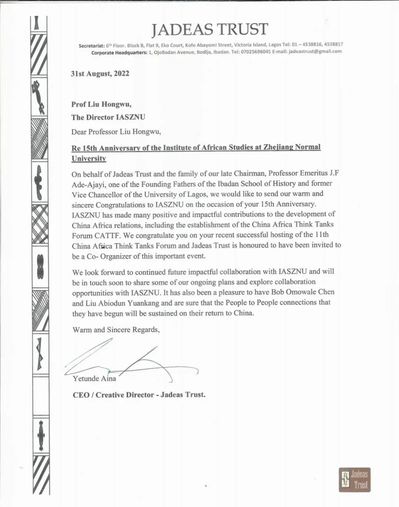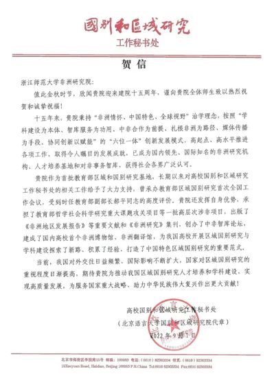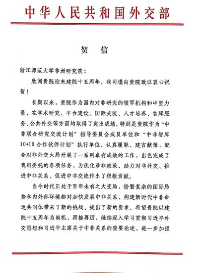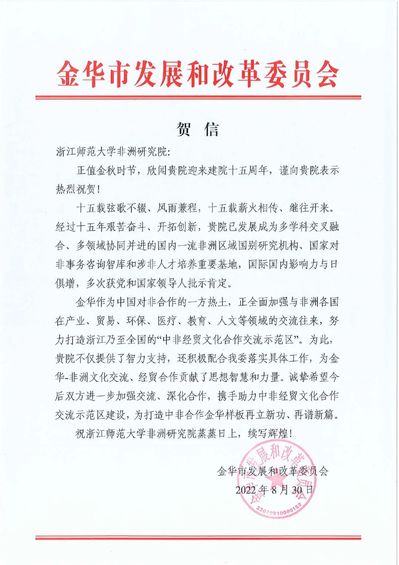 此外,金华市人民政府外事办公室、中国国际贸易促进委员会金华市委员会、金华市人民政府对外联络办公室、金华市对非经贸商会、浙非文化经贸服务中心、广西民族大学东盟学院、暨南大学国际关系学院/华侨华人研究院、浙江树人学院白俄罗斯研究中心等机构和组织也发来贺信,一并致谢!