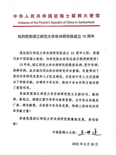 今年9月1日,是浙江师范大学非洲研究院成立15周年纪念日。在这个承前启后的日子里,中国外交部非洲司、尼日利亚阿贾伊基金会、中国驻瑞士大使王世廷等单位和个人来函祝贺,充分肯定浙师大非洲研究院15年来在学科建设、智库服务、公共外交、人才培养等方面的创造性实践和突出性成效,鼓励浙师大非洲研究院再接再厉,续写精彩。