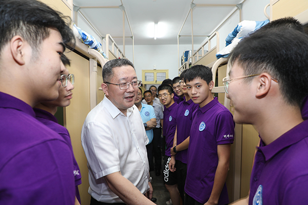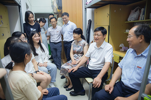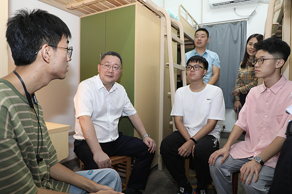 “老家是哪里的?”“到学校还习惯吗?”“未来有什么打算?”郑孟状一行先后走访了人文学院、物电学院的部分新生寝室,亲切询问了同学们对大学的感受和适应情况,希望同学们尽快融入集体,做好学业规划,珍惜青春时光。在与人文学院新生的交谈中,郑孟状详细了解了同学们的职业规划,勉励同学们尽早确立奋斗目标,不断提升自己的综合素质,不断打磨专业技能,努力成长成才。在物电学院新生寝室,郑孟状一一与同学们握手,勉励同学们向优秀学长杨学明看齐,志存高远,潜心学问,把握大好的青春年华,踏实学好专业知识,成为可堪大用的国家栋梁。