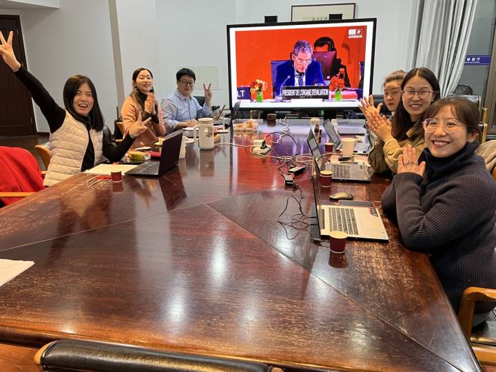 浙江师范大学教授王巨山、中国丝绸博物馆周娅鹃、中国茶叶博物馆李昕和朱阳、省文化和旅游厅非遗处叶涛等工作专班的成员,激动地庆祝申遗成功。