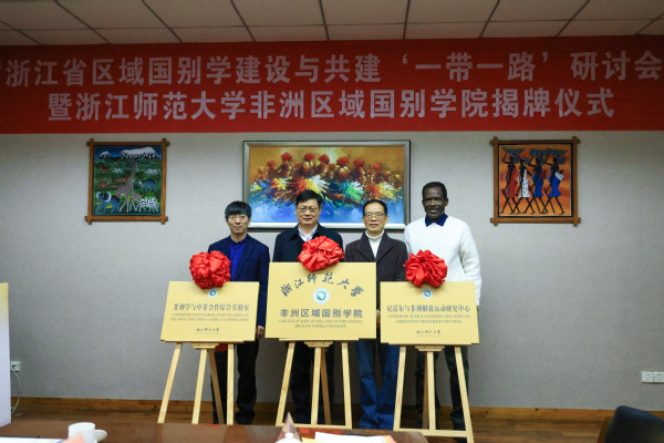 浙江师范大学非洲区域国别学院正式成立。蒋云良,钟依均,前马里驻华参赞、浙师大非洲研究院高级研究员约罗,浙师大非洲研究院(非洲区域国别学院)创始与现任院长刘鸿武教授共同为学院揭牌。