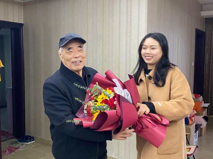 邹姝颖(后一)向毛华岳(左一)送花(共享联盟·金华 季俊磊 摄)