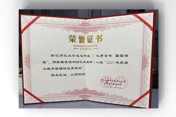 《“礼赞百年 强国有我”,用新媒体唱响时代主旋律》入选浙江省教育新媒体优秀案例奖荣誉证书。