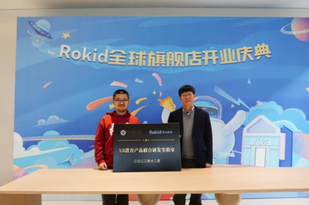 浙江师范大学与Rokid在XR教育产品研发上有着共识与共同的愿景,今日在Rokid全球首家品牌旗舰店开业现场,双方签署了战略合作协议,成立联合实验室,围绕“XR教育平台”,形成以XR技术为核心的智能视听场景。