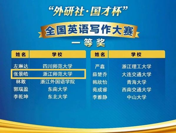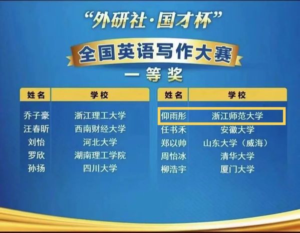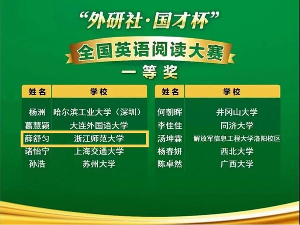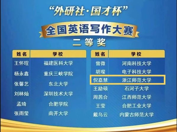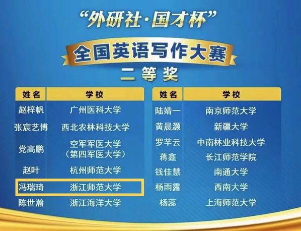 日前,2022年“外研社·国才杯”全国英语演讲、写作、阅读大赛全国决赛落幕,浙江师范大学外国语学院学子荣获全国一等奖3项,二等奖3项,三等奖1项,获奖数量再创新高。其中,英语201班张景皓、英语204班仰雨彤在英语写作大赛中获全国一等奖,英语204班薛舒匀在英语阅读大赛中获全国一等奖,英语202班倪嘉慧、英语207班冯瑞琦在英语写作大赛中获全国二等奖,英语203班盛轶斌、英语206班柳菁菁在英语演讲大赛分获全国二等奖、三等奖。