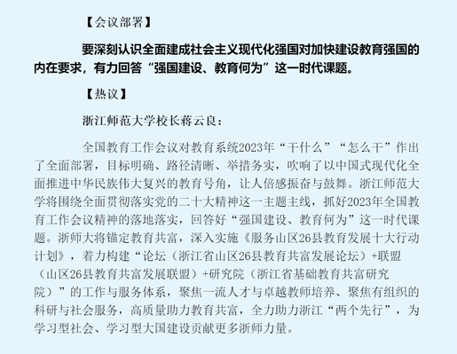 1月14日,《中国教育报》头版刊发浙江师范大学校长蒋云良教授热议2023年全国教育工作会议。在《稳中求进 办好人民满意的教育——地方和高校热议2023年全国教育工作会议重点工作部署》中,蒋云良聚焦“要深刻认识全面建成社会主义现代化强国对加快建设教育强国的内在要求,有力回答‘强国建设、教育何为’这一时代课题。”谈了心得体会。
