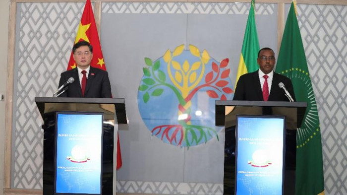 1月10日,中国外交部长秦刚同埃塞俄比亚副总理兼外长德梅克会谈后共同会见记者并答问。(中国驻埃塞俄比亚大使馆)