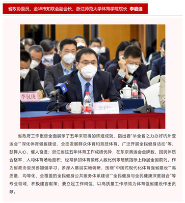1月14日,金华政协公众号推出文章《连线省两会 | 话感想、议发展、献良策 住金省政协委员这样说》。省政协委员、浙师大李启迪教授表示,省政府工作报告全面展示了五年来取得的辉煌成就,指出要“举全省之力办好杭州亚运会”“深化体育强省建设,全面发展群众体育和竞技体育,广泛开展全民健身活动”等,鼓舞人心,催人奋进;浙江省这五年体育工作成绩优异,在东京奥运会金牌数、国民体质合格率、人均体育场地面积、经常参加体育锻炼人数比例等硬核指标上稳居全国前列。作为省政协委员要加强学习,多深入基层实地调研,围绕“中国式现代化体育强省建设”“高质量、均等化、全覆盖的全民健身公共服务体系建设”“全民健身与全民健康深度融合”等专业领域,积极建言献策;要立足工作岗位,以高质量工作绩效为体育强省建设作出贡献。