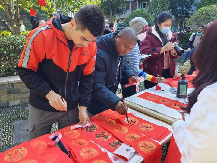 品年俗美食、做新春挂饰、玩投壶游戏……为了让留校学生感受浓浓的年味,在农历春节即将到来之际,浙师大后勤服务中心学生社区精心组织了一场新春游园会,吸引了百余名留学生一起参与其中。