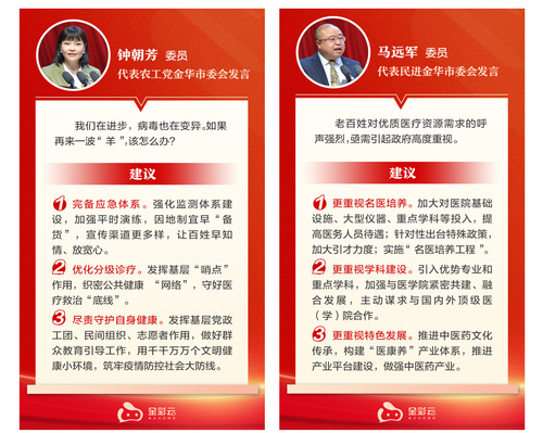 市政协委员钟朝芳代表农工党市委会作题为《疫情防控新阶段如何守护健康》的大会发言,建议完备应急体系,强化监测体系建设,加强平时演练,因地制宜早“备货”;优化分级诊疗,发挥基层“哨点”作用,织密公共健康“网络”,守好医疗救治“底线”;尽责守护自身健康,发挥基层党政工团、民间组织、志愿者作用,做好群众教育引导工作,筑牢疫情防控社会大防线。她还建议创建“金华市传统文化亲子教室”,为浙江共同富裕示范区建设打造鲜活的实践样本。