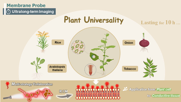 细胞膜(又称质膜)作为保护细胞内环境的屏障,在细胞迁移、细胞增殖、胞吞、胞吐、信号传导和细胞凋亡等生物学事件中起着重要的作用。细胞膜的形态直接反映细胞的生理状态;例如,细胞膜破裂是药物诱导细胞凋亡的重要证据。因此,对细胞膜进行长时间的特异性成像和实时跟踪对于研究细胞生物学、药理学和毒理学具有重要的意义和价值,是生命科学领域常用的工具之一,因而相应荧光探针的开发具有巨大的市场前景。尽管以DIO为代表的第一代细胞膜探针已经市场化,但是这些荧光探针只能在很短时间内特异染色细胞膜,在半小时染色时间内就会将整个细胞染色,无法为观察细胞膜相关的生理过程提供足够的时间窗口。目前,美国Biotium公司和赛默飞公司分别针对这一问题开发了可以进行较长时间域的细胞膜成像探针CellBrite系列和CellMask系列,但是仍然无法实现数小时级别的高特异性成像。相比于动物细胞膜,由于植物细胞壁的存在使得针对植物细胞膜的荧光探针设计更为复杂,因此开发用于植物细胞质膜的长时间精准成像及长期示踪的成像工具仍然面临着巨大的挑战。