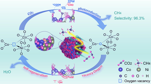 近日,浙江省“万人计划”杰出人才胡勇教授课题组在光催化CO2还原机制方面取得重要进展。相关成果以题为“Efficient Visible-Light-Driven CO2 Methanation with Self-Regenerated Oxygen Vacancies in Co3O4/NiCo2O4 Hetero-Nanocages: Vacancy-Mediated Selective Photocatalysis”的研究论文发表在催化领域国际顶级期刊ACS Catalysis(中科院分区一区,影响因子13.700)上。浙江师范大学2020级硕士研究生倪貌貌为该论文第一作者,胡勇教授、陈德利副教授、郭长发(校聘)副教授为论文通讯作者,浙江师范大学为论文唯一完成单位。