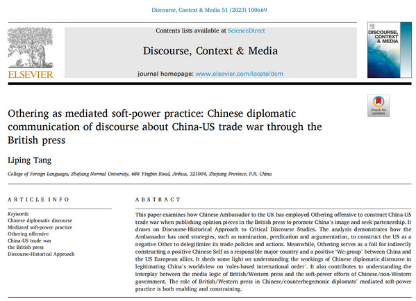 近日,浙江师范大学“双龙学者”特聘教授、外国语学院唐丽萍教授在国际期刊《话语、语境与媒体》(Discourse, Context & Media)第51卷在线发表学术论文“媒介化软实力实践与他者攻势——在英国报刊开展涉中美贸易战反霸权话语的中国外交传播”(Othering as mediated soft-power practice: Chinese diplomatic communication of discourse about China-US trade war through the British press)。该期刊由国际权威学术出版集团爱思唯尔(Elsevier)出版,被SSCI收录。根据期刊官网引用 CiteScore 和 SJR 期刊评价指标,该期刊为文化研究和传播学研究领域一区期刊。该论文是唐丽萍教授主持的国家社科基金项目(中国展现负责任大国形象外媒传播的话语研究)的阶段性成果。浙江师范大学为该论文唯一完成单位。