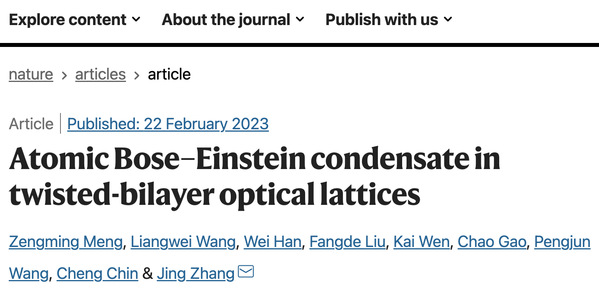 近日,浙江师范大学物理与电子信息工程学院高超教授与山西大学、美国芝加哥大学等单位学者合作在国际顶级期刊 Nature 上发表了研究论文,题为“Atomic Bose–Einstein condensate in twisted-bilayer optical lattices”(扭曲双层光晶格中的原子玻色-爱因斯坦凝聚体)。该研究首次在超冷原子气体中制备了扭曲双层晶格系统,并探索了具有高度可控光晶格超冷原子的莫尔物理,开辟了新的方向。