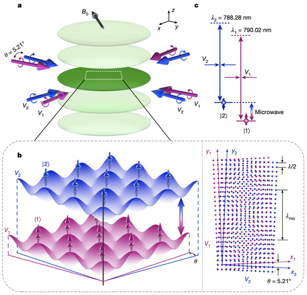 高超等人在 Nature 上发表的研究论文,介绍了基于超冷原子气体的新型扭曲双层晶格。他们利用原子的自旋这一内禀自由度作为人造的两层维度,对自旋的两分量分别用激光束组施加独立控制的二维光晶格,并使两套晶格相差一个小的旋转角度,从而实现了扭曲双层晶格。