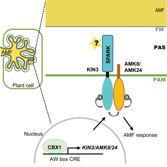 该研究阐明转录因子CBX1调控的KIN3-AMK8/24类受体激酶复合物在菌根共生中发挥关键作用, 暗示存在跨围丛枝膜调控丛枝发育的信号通路。 后续将通过研究复合物的互作蛋白或信号分子,解析信号转导途径,包括其胞外感知组分和下游信号传递组分等。