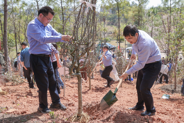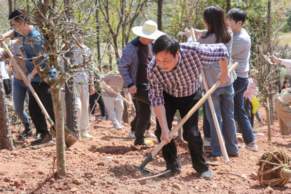 挖出树坑、挥锄松土、固定树苗、提桶浇水……师生们分工合作,原本荒芜的山坡地上很快立起了一棵棵小树。烈日当头,辛勤的汗水挥洒在土地上,化作树苗扎根后的第一份养料。汗水与欢笑充满了共青林的山坡,师生们纷纷与种下的树苗合影,定格这有纪念意义的一刻。