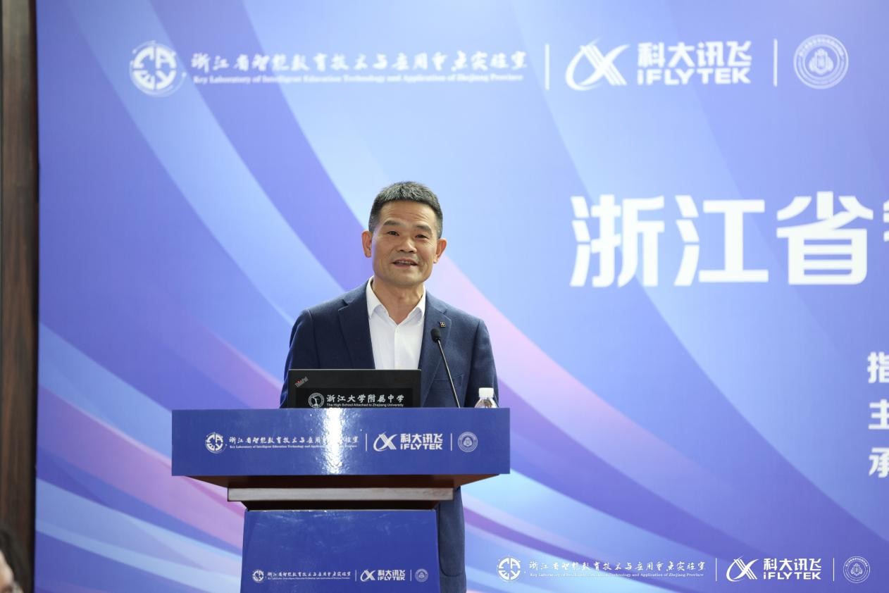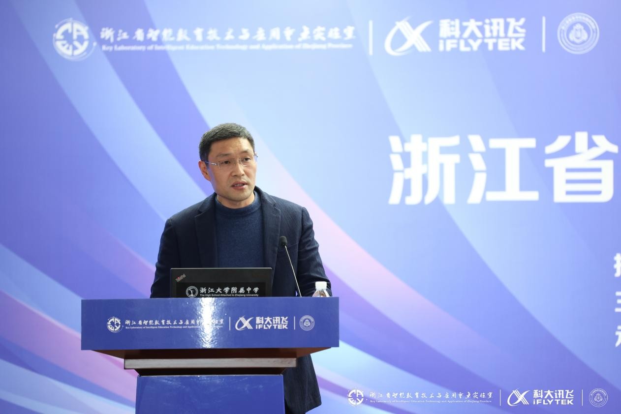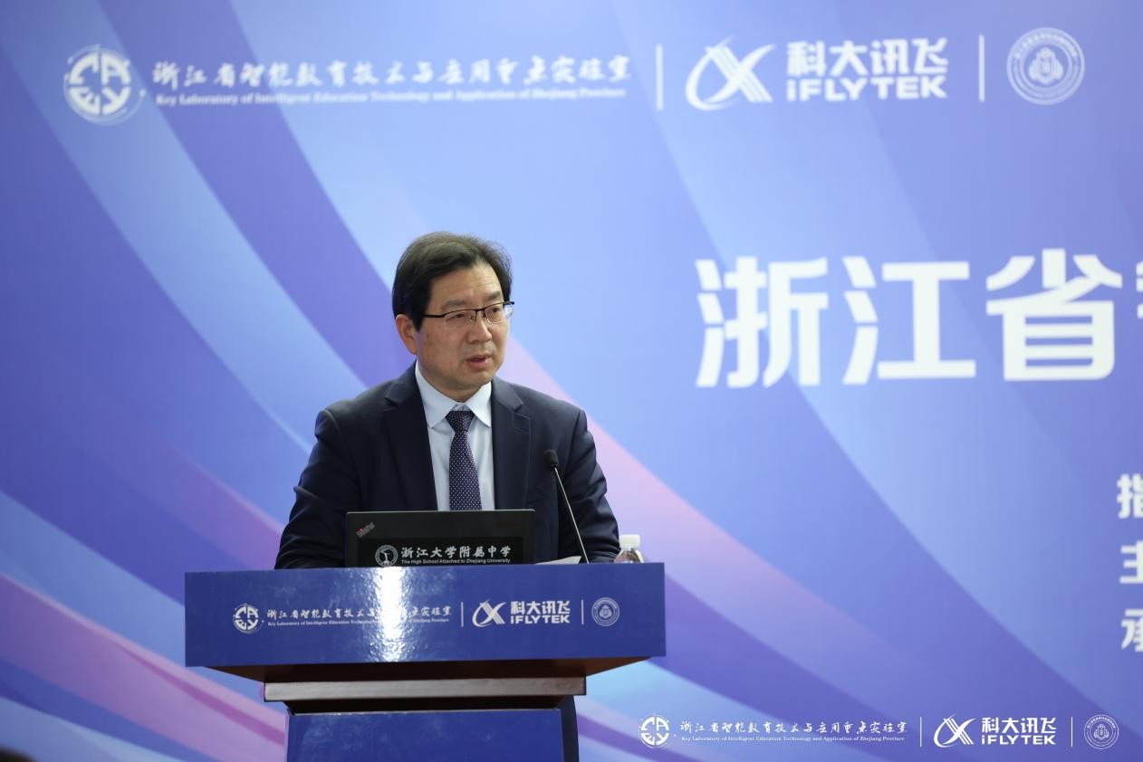 周跃良在致辞中表示,成立“浙江省智慧学校实践共同体”谋划已久,很高兴能与科大讯飞共同发起,联合省内29所优秀的智慧教育示范学校启动这项事业。浙江师范大学作为省内教师教育的重要阵地,自建校以来向社会输送了大批优质师资,近10年来,学校也在智能教育领域快速发展,并牵头成立了浙江省智能教育技术与应用重点实验室。我们期待和大家携手并进,通过共同体发展,推动建成浙江省内领先、在国内有一定影响力的智慧教育生态体系,促进区域教育信息化素养水平和教育质量发展整体跃升。