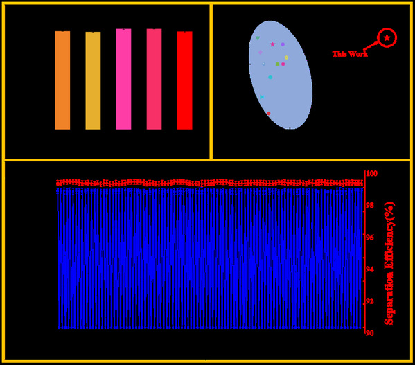 图1. (a)5种不同油水混合液的分离效率;(b)四个月100次循环测试中的分离效率;(c)与文献报道的分离效率及水通量的对比