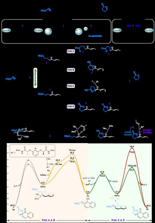 长久以来,高价碘介导的苯酚去芳构化的反应机理存在着争议。从宏观上,反应机理可以分为三类:缔合机理(associative pathway)、解离机理(dissociative pathway)和自由基机理(radical pathway),但是解离机理或自由基机理中产生的游离酚氧鎓离子或者酚氧自由基无法实现立体选择性的去芳构化历程,反应只有经历缔合机理才有望实现不对称去芳构化反应。以第一代Ishihara柔性芳基碘催化的苯酚去芳构化反应为例,对于缔合机理的具体历程,文献又报道了以下三种机理(Path A~C)。郑汉良博士通过理论计算发现,文献中所提出的三种机理反应能垒都较高(> 25.0 kcal mol-1),无法较好地解释反应现象。经过细致的分析与探索,郑汉良博士揭示了一种全新的苯酚去芳构化反应机制:质子迁移耦合的去芳构化(proton-transfer coupled dearomatization, PTCD)机理。该机理表明底物羧基向高价碘配体的质子迁移对于促进反应至关重要,其能够同时增强芳基碘的离核性与羧酸的亲核性,从而显著降低反应能垒。