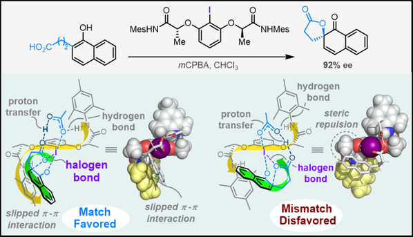 在自然界中,酶的“柔性”被认为是其实现高选择性的重要因素之一,基于酶的“柔性”所提出的诱导-契合模型(induced-fit model)或构象选择模型(conformational selection model)已被广泛接受。然而与自然界不同的是,在立体选择性的化学反应中则常引入“刚性”以实现选择性诱导。这是由于“刚性”因素通常以位阻效应直接作用于底物,其控制模式更加直接与直观,因此引入“刚性”的设计理念一度成为配体与催化剂设计中的主流。近年来,一些柔性催化剂的发展则突破了“刚性”设计理念的桎梏,Ishihara柔性芳基碘催化剂是其中最具代表性的例子之一,该类催化剂在不对称羰基a-官能团化、烯烃双官能团化、苯酚去芳构化反应中发挥了重要作用。然而,对于这类柔性的催化剂,其选择性控制模型仍未得到较好的理解,显著限制了对这类“柔性”催化剂的认识与进一步改造设计。为此,郑汉良博士通过密度泛函理论计算与实验结合详细研究了第一代Ishihara柔性芳基碘催化的苯酚去芳构化的反应机理与手性控制模型。