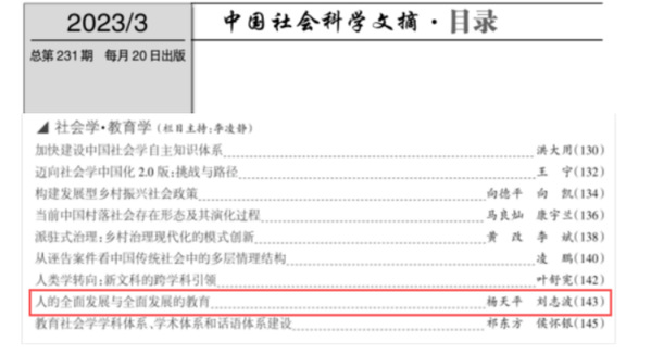 近日,《中国社会科学文摘》2023年第3期转载浙江师范大学教育学院杨天平教授、博士研究生刘志波的署名文章《人的全面发展与全面发展的教育》。