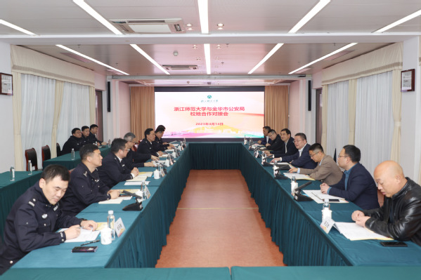 4月14日,浙江师范大学与金华市公安局校地合作对接会议在行政中心多功能会议室举办。金华市副市长、公安局长徐建役,市公安局党委委员、政治部主任金常法,市公安局党委委员、副局长王浦虹,浙师大党委书记郑孟状出席会议,浙师大党委副书记朱坚主持会议。