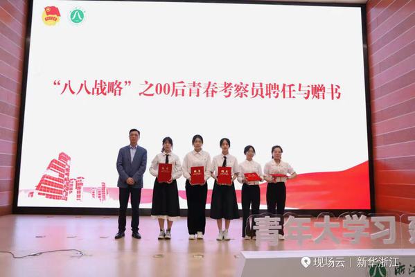 柴骥程为“八八战略”之00后青春考察员代表颁发聘书,并赠送《干在实处 勇立潮头——习近平浙江足迹》《之江新语》《习近平在浙江》等书籍,以及《新华每日电讯》《参考消息》数字报。