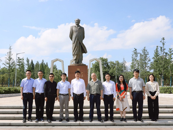蒋云良一行在毛主席铜像前合影留念,并参观了湘潭大学校史馆。