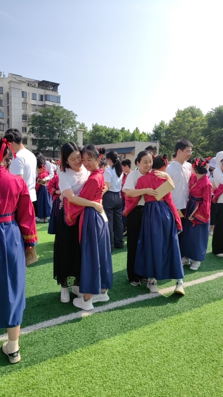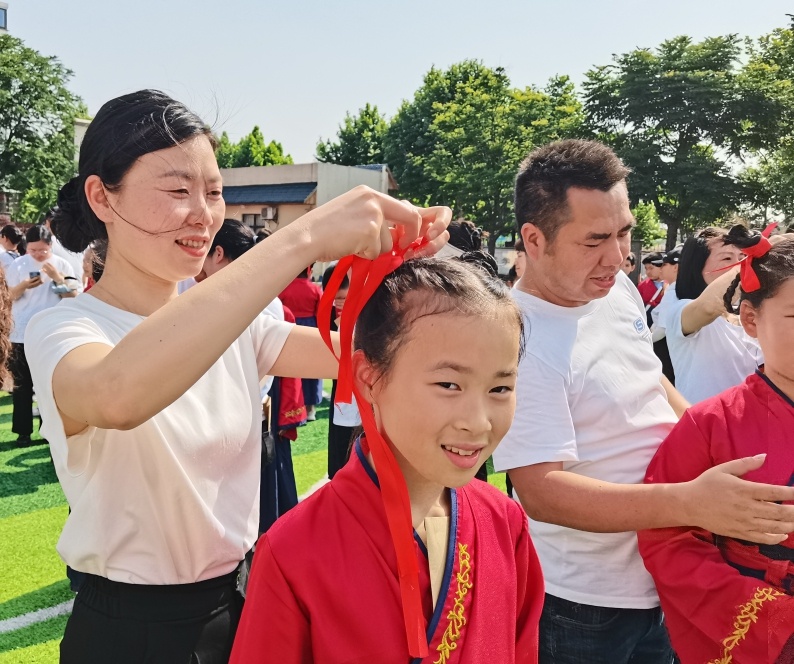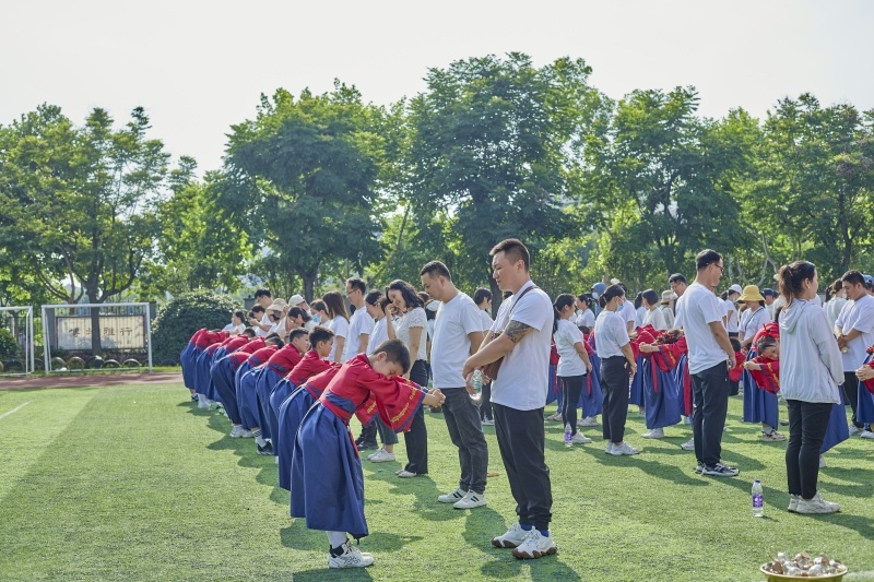四年级的学生们身着汉服,在父母的陪伴下,共同完成了庄重的十岁生日成长礼。“成长礼”分为三个阶段,第一阶段,孩子们在父母的陪伴下度过无忧无虑的儿童时光,在父母的殷殷嘱托中系“总角”。“总角”语出《诗经》,意指童年。在十岁成长礼上,父母亲手为孩子系总角,寓意孩子从此告别幼年,需学会更多的本领,懂得更多的道理,承担更多的责任。