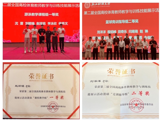 经过赛前的精心准备及比赛过程中在课堂教学与体育技能展示部分的激烈角逐,赵炫铭以总分排名游泳项目第一名的成绩,勇夺全国高校教师教学与训练比赛一等奖,刘洋洋以其精湛的专业教学水平荣获篮球“竞训指导组”二等奖。