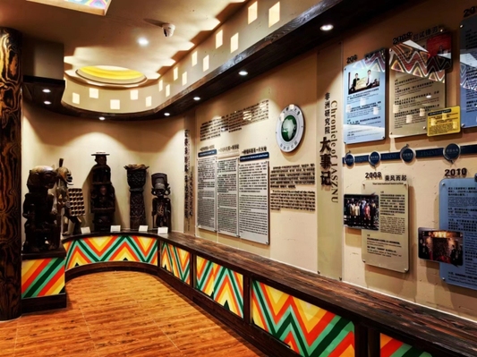 老馆占地400多平方米,集合木雕、面具、乐器等1000多件精美非洲艺术品;新馆面积大体相当,把中非往来2000年来的历史事件浓缩于一体,分三个板块展示了中国与非洲古往今来在政治、经贸、人文、艺术等不同领域之间交往交流历史与现状。