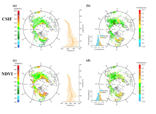 生长峰值物候POS在塑造总初级生产力GPP的季节动态方面发挥着重要作用。然而,陆地生态系统季节动态中POS的驱动机制仍不清楚。研究基于2001~2020年北半球太阳诱导叶绿素荧光SIF和归一化植被指数NDVI数据,采用三种物候提取方法,分析了过去20年北半球POS的时空模式及POS趋势的驱动机制。研究发现,北半球POS呈缓慢的提前,而延迟的POS主要分布在北美洲东北部;POS的趋势是由生长季开始时间SOS而不是由pre-POS的气候驱动的;SOS对POS趋势的影响在灌丛中最强,而在常绿阔叶林中最弱。这些发现强调了生物节律在探索季节性碳动力学和全球碳平衡方面的关键作用。