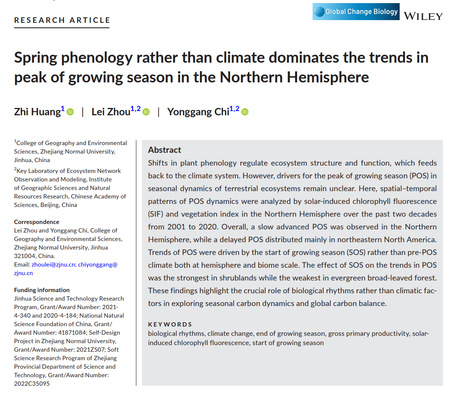 近日,浙江师范大学地环学院周蕾研究组在Global Change Biology期刊上发表了题为“Spring phenology rather than climate dominates the trends in peak of growing season in the Northern Hemisphere”的论文。Global Change Biology是全球变化生态学领域的顶级期刊,为SCI一区TOP期刊,最新影响因子为13.211。2021级地图学与地理信息系统专业硕士研究生黄智为论文第一作者,周蕾副教授和迟永刚副教授为联合通讯作者。