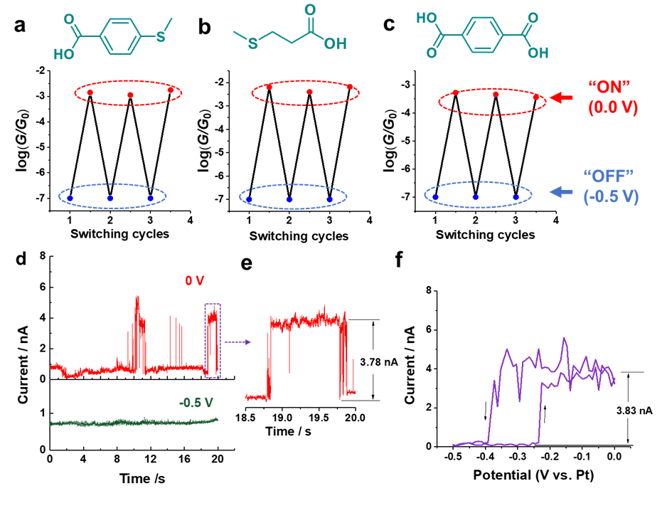 为了进一步证明局域阳离子调控的可逆单分子开关,作者对三种羧酸分子进行电导循环测量,发现0 V电导峰重复出现,-0.5 V则消失,且具有很好的循环稳定性。进一步进行I-t测试,发现0 V可以观察到电流跃变到ON状态,而电位控制在-0.5 V时,则只观察到了基线电流及其波动。同时I-V测试结果也表明,在电位负向或正向扫描过程中,电流会跳变到低值或高值。这对应于分子结的断裂和形成,且电流绝对差值与单分子电导测量结果一致,进一步证明局域阳离子调控可逆单分子开关的可行性。
