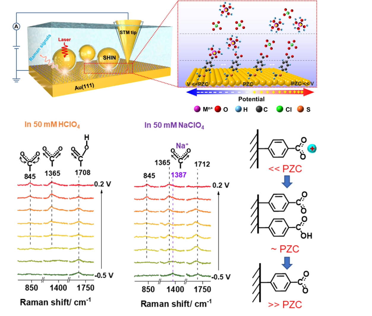 该工作首次利用电化学STM-BJ、I-t和I-V技术在羧酸分子结中成功实现了局域阳离子控制的可逆单分子开关,并借助原位拉曼光谱,阐述其开关机制,为通过栅电极实现可逆单分子开关开辟了一条新途径。