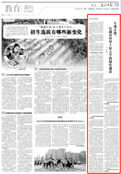 6月13日,《光明日报》第13版刊发浙江师范大学教育学院边新灿教授文章《专项计划:打通农村娃上好大学的绿色通道》。