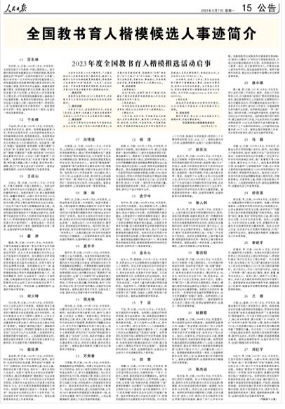 人民日报、光明日报、中国教育报刊登候选人名单及事迹简介,教育部门户网站、人民网、新华网、光明网、中国青年网、中国教育新闻网、中国教育网络电视台等开辟专题网页刊登候选人名单及事迹简介,面向社会公示,公示时间从8月7日到8月11日。