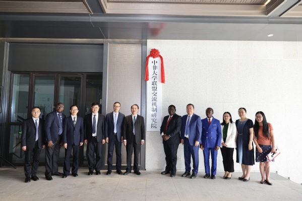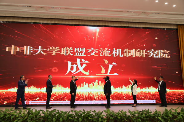 张大良、奥卢索拉·奥耶沃勒、蓝晶晶、陈江风、郑孟状、蒋云良共同为中非大学联盟交流机制研究院揭牌。