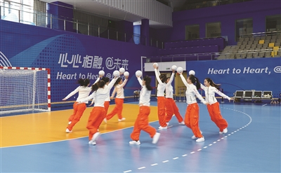 9月9日,浙江师范大学(萧山校区)场馆群运行团队举行杭州亚运会赛前誓师动员大会,场馆全体工作人员和志愿者为全力冲刺亚运立下铮铮誓言。杭州亚运会期间,浙师大(萧山校区)体育馆将承办手球比赛。图为动员大会现场,浙师大悦动啦啦操队展示手球操表演。(本报通讯员 诸世炎 摄)