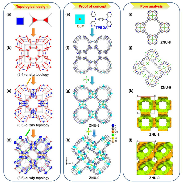 张袁斌课题组长期从事吸附分离研究,通过引入高密度位点阴离子、构筑多级孔结构等策略调控离子杂化金属有机框材料结构,实现了乙炔/二氧化碳(Angew. Chem. Int. Ed. 2021, 60, 22865-22870)、乙炔/二氧化碳/乙烯(Nat. Commun. 2023, 14,401.)、丙炔/丙烯(Angew. Chem. Int. Ed. 2022, 61, e20220094)、二氧化碳/氮气(Adv. Funct. Mater. 2023, 33, 2213915)等重要体系的基准分离。受上述多级孔策略启发,课题组通过将三齿配体延伸至四齿配体,构筑了两例具有新拓扑结构的多级孔离子杂化金属有机框材料ZNU-8和ZNU-9,实现了C2H2/CO2和C2H2/C2H4的高容量高选择性分离。