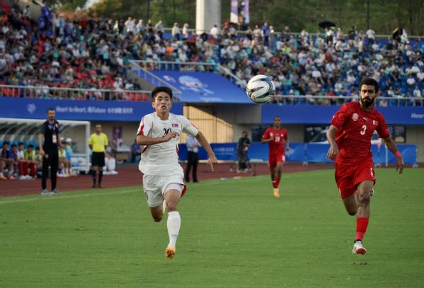 9月27日下午,杭州第19届亚运会男子足球1/8决赛,朝鲜队对巴林队的比赛在浙江师范大学东体育场举行。