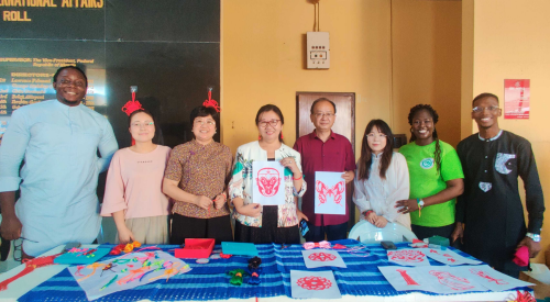 拉各斯大学孔院在中国文化展位展示中国结和剪纸艺术。严总领事和刘鸿武院长工作交流并分别接受尼媒体记者采访。