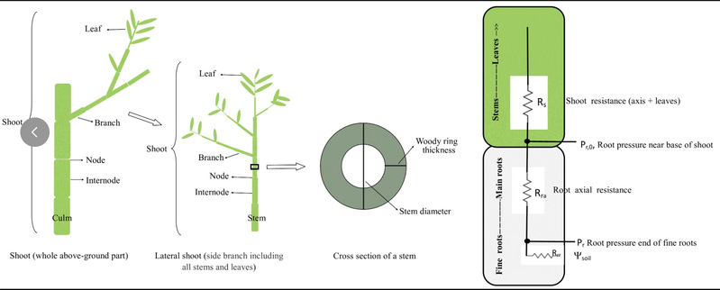 ,其中b和c是植物水分运输阻力、土壤水势、溶质通量和重力势的函数。在本研究中,作者使用典型竹枝的测量数据集对模型进行了验证,结果表明该模型展示了根压介导的水分在6.8米高竹枝中的水力结构分布。该模型为检测根压在水力结构形成和修复木质部栓塞中的潜在功能提供了理论基础,也将促进根据模型探讨根压功能的进一步研究。