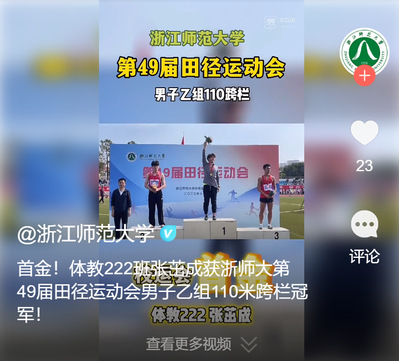 潮新闻客户端:首金!体教222班张茁成获浙师大第49届田径运动会男子乙组110米跨栏冠军!
