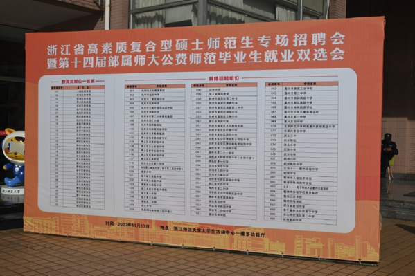 11月17日下午,浙江省高素质复合型硕士师范生专场招聘会暨第十四届部属师大公费师范毕业生就业双选会在浙江师范大学大学生活动中心一楼召开。学校多方位为招聘会保驾护航,利用各大就业网站、浙师就业服务平台为学子们收集了各类招聘信息,并第一时间做好毕业生签约服务和咨询保障工作。
