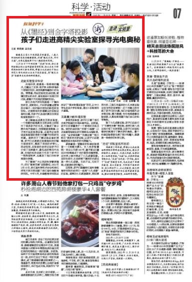 参观完实验室,孩子们又看了浙江光电子院里的光电科普作品。在那里,孩子们仿佛置身于一个神奇的光电王国。绚烂的迷你版广州塔“小蛮腰”、以光电画笔绘制出的可爱鸵鸟与海豚等,还有 “金字塔投影”“光栅动画”“视力矫正”等多项光学实验,让孩子们近距离感受到光电科技的无限魅力。