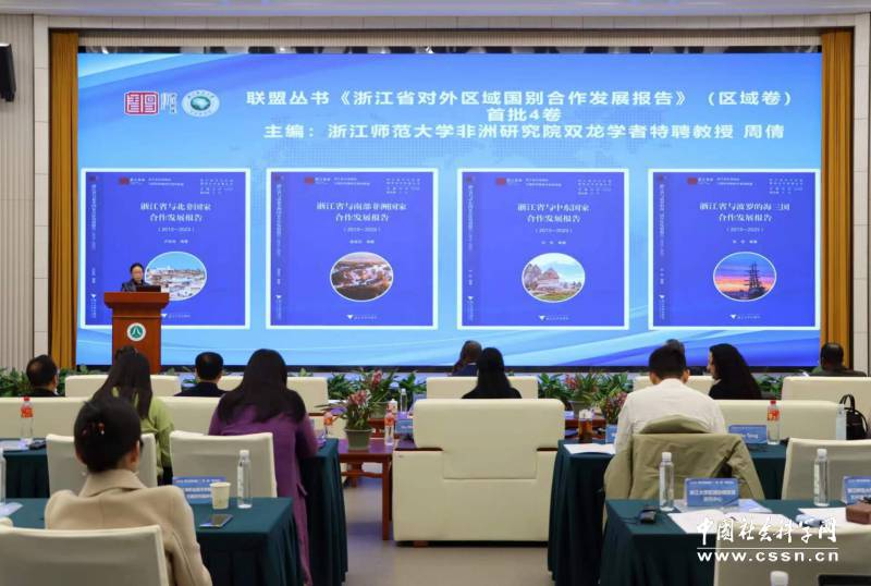 周倩发布《浙江省与中东国家合作发展报告(2013-2023)》《浙江省与南部非洲国家合作发展报告(2013-2023)》《浙江省与波罗的海三国合作发展报告(2013-2023)》《浙江省与北非国家合作发展报告(2013-2023)》等首批4部著作 主办方供图