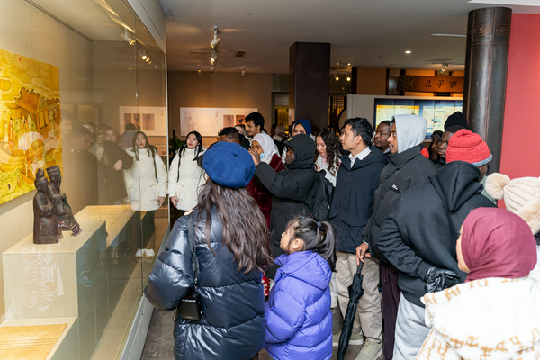 随后,留学生们来到第二站中国儒学馆。在解说员的带领下学习了博大精深的儒家文化。通过馆内的互动道具,体验了君子六艺“礼、乐、射、御、书、数”。